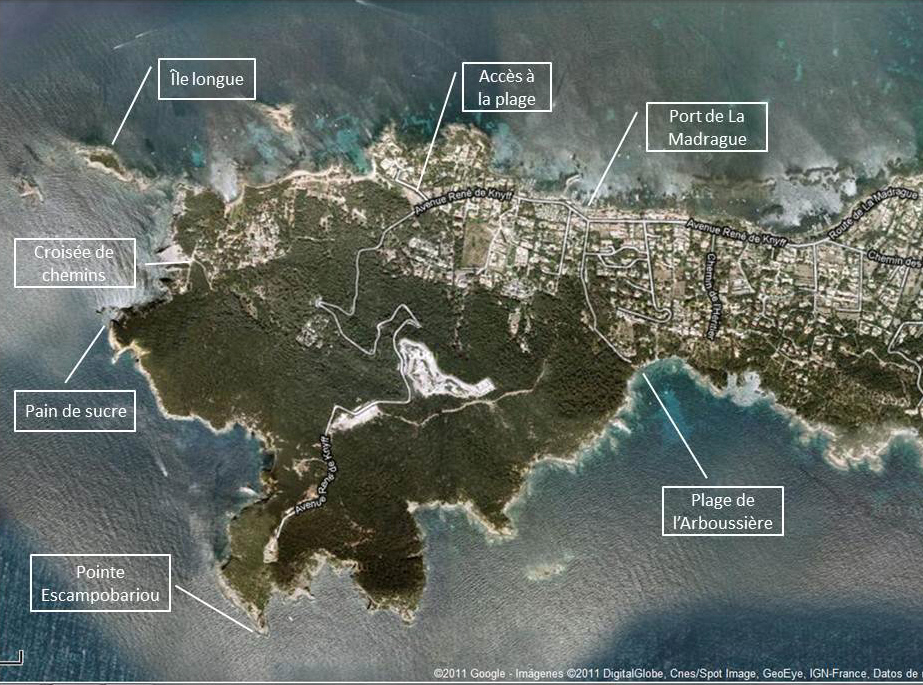 A little further, we find a crossroad where several dirt trails meet. We can choose wether to go towards the Madrague by the inland trail, taking one of the trails that go deep in the woods, or continue on the coastal trail for a longer walk and great views. We then pass the very steep Pointe d’Escampobariou, which in Provencal means « breakaway barrels », name that testifies the agitated waters that surround the cape when stong winds blow, to continue to the beach of l’Arboussière, where we’ll return to the Madrague by the route that cuts the point from side to side.