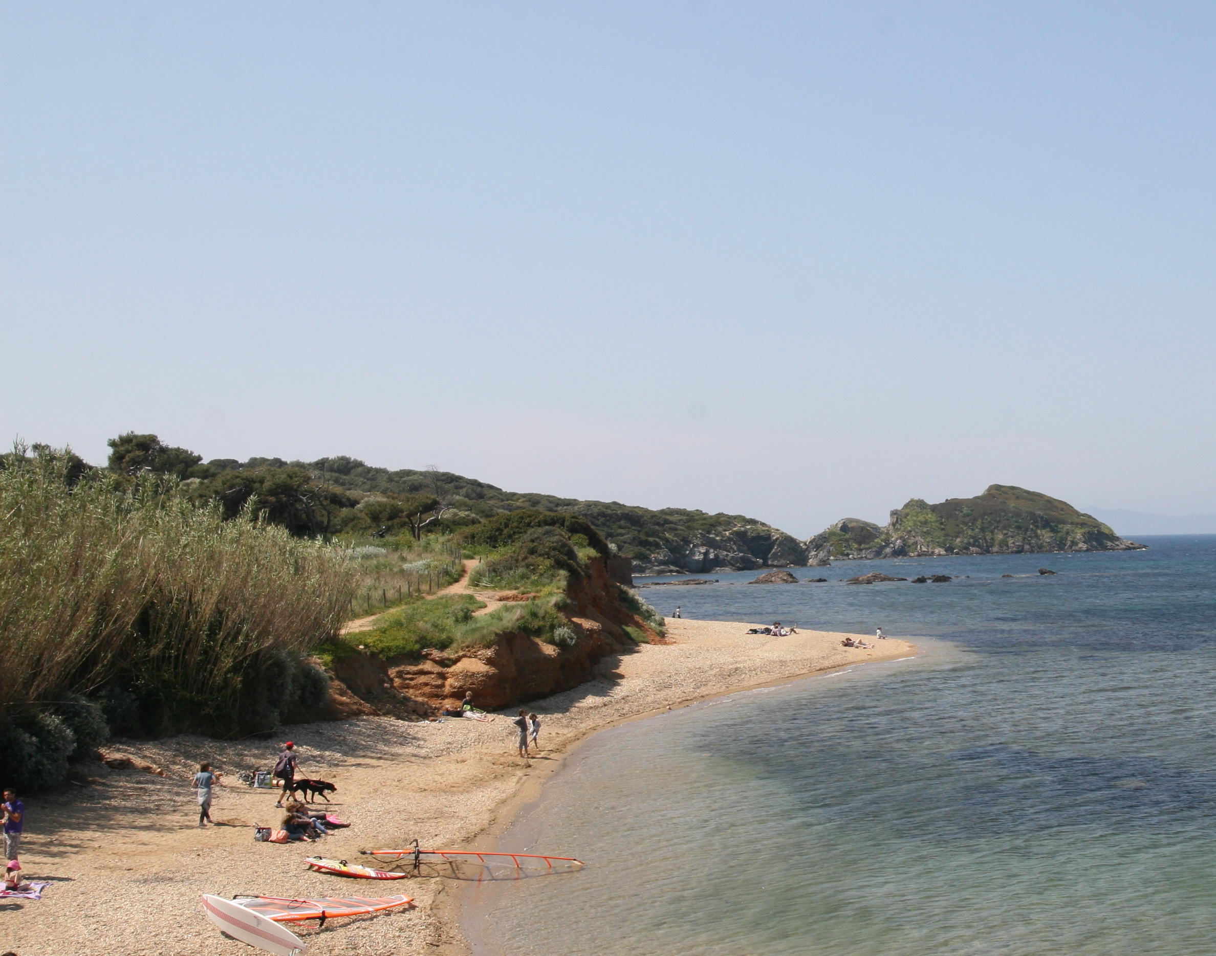 A sign indicated the acess to the Beach (« Accès à la plage »). Take the trail tothe right that leads to a beautiful small beach, with view on the Salins des Pesquiers and the beach of l’Almanarre.